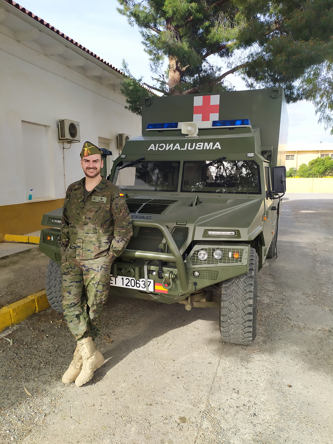 El primero es de Cuerpos Comunes —del alrededor de medio centenar activados desde finales de marzo y principios de abril—. El alférez (RV) Aguirre es enfermero en el área de Urgencias del hospital de Poniente de El Ejido (Almería) y, como tal, ha vivido en primera persona la crisis en el mes de abril, atendiendo a centenares de personas cuando la situación estaba en su punto álgido. No obstante, él había solicitado su activación para los meses de marzo (en una unidad del ET) y mayo (en otra del EA), donde también ha puesto su granito para que la operación “Balmis” no tuviera que lamentar bajas. Concretamente, en el mes de marzo estuvo en el botiquín de la Brigada “Rey Alfonso XIII” II de la Legión. Lo que a priori parecía un mes tranquilo, empezó a cambiar pronto. «Hubo un caso positivo en uno de los participantes en unas maniobras; se hizo regresar al grupo y hubo que dejar a todos en cuarentena. Se habilitó una zona de desinfección para vehículos y material, y el personal se fue con medidas preventivas a su domicilio», comenta. El 14 de marzo se decretó el estado de alarma, el 15 comenzó la operación “Balmis” y el trabajo continuó aumentando en el botiquín de la base “Álvarez de Sotomayor”.
