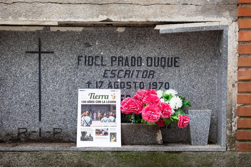 Pero este artículo quiere traer en el centenario a ese versificador olvidado, Fidel Prado Duque, que escribió, para la Legión y para Lola Montes, la que ella consideraba la canción más bonita del mundo. Por eso, el periódico Tierra ha ido al cementerio de Santa María, en el madrileño distrito de Carabanchel, a mostrarle sus respetos a este versificador de sueños; mientras se oye como una letanía: «Soy un hombre a quien la suerte hirió con zarpa de fiera; soy un novio de la muerte que va a unirse en lazo fuerte con tan leal compañera…».