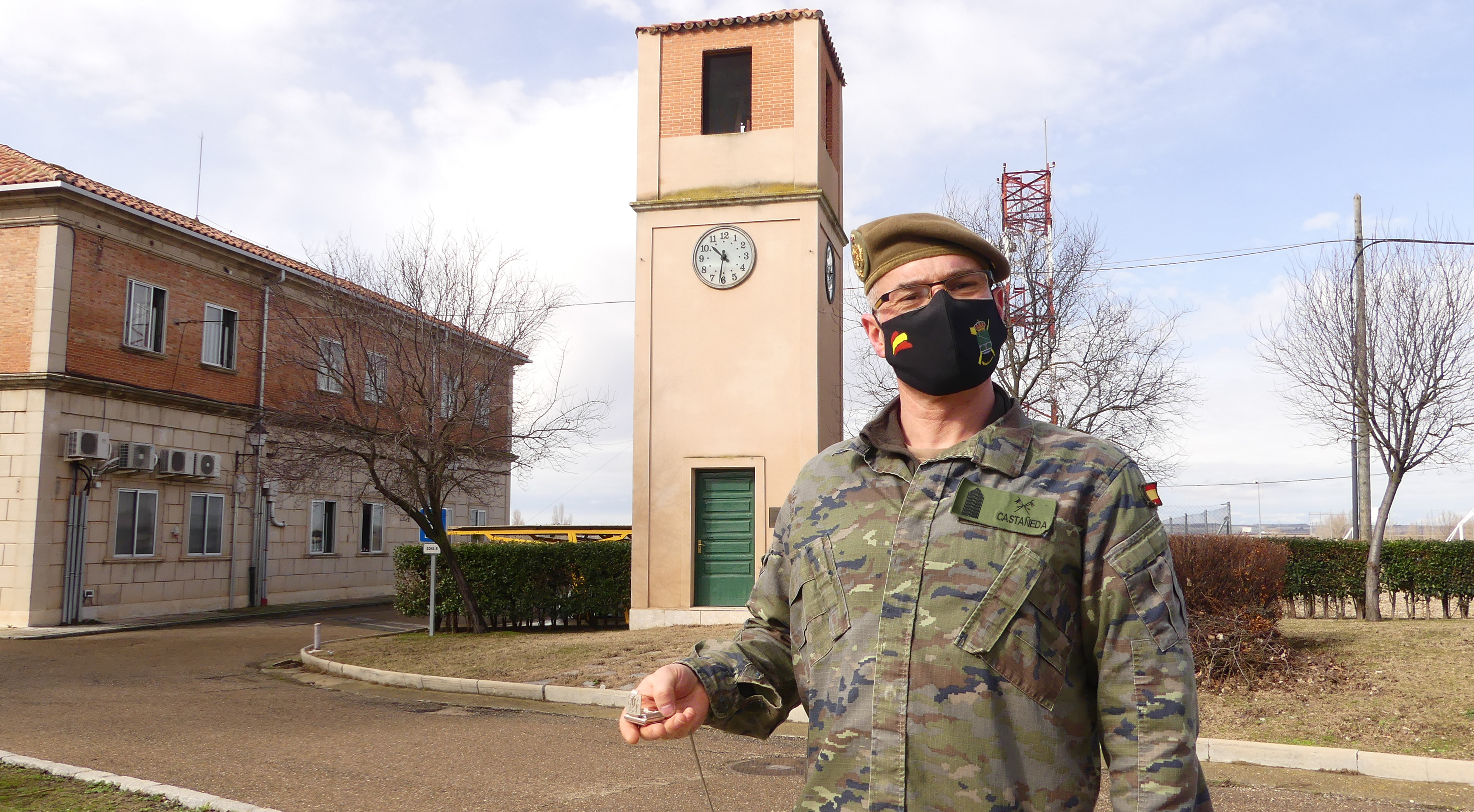 Tras el cierre del cuartel, el reloj fue trasladado a la base “El Empecinado”, en Santovenia de Pisuerga (Valladolid), donde pasó un tiempo olvidado en un almacén, hasta que en 2007 se decidió arreglar y colocar en una torre de electricidad habilitada para ello. Sin embargo, poco duró en funcionamiento, ya que un reloj de estas características requiere de un mantenimiento muy especializado y constante que no todos saben llevar a cabo, y que no pudo continuarse una vez que el relojero encargado se jubiló. «Muchos intentaron arreglarlo, aunque no conseguían averiguar por qué se retrasaba o, directamente, se paraba», comenta el brigada Castañeda, artífice de que el mismo esté hoy día en funcionamiento y quien ha estado destinado en la Unidad de Servicios de Base (USBA) “El Empecinado” hasta su reciente ascenso a mediados de marzo.