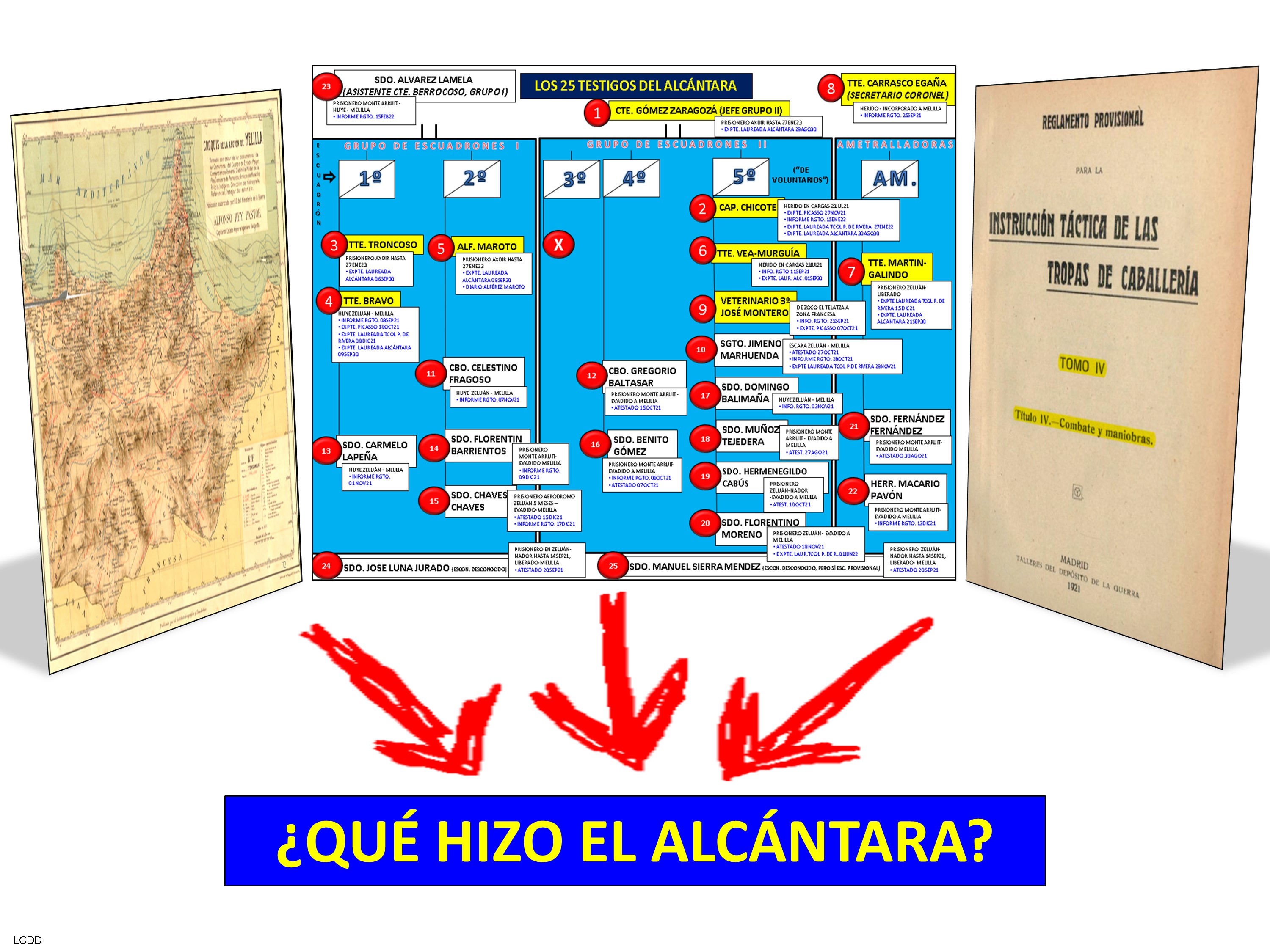 Para ello utiliza principalmente los testimonios de veinticinco testigos supervivientes del Alcántara, apoyándose en cartografía oficial de esa época y en el reglamento de Caballería de entonces, analizando todo ello bajo su perspectiva de oficial de caballería.