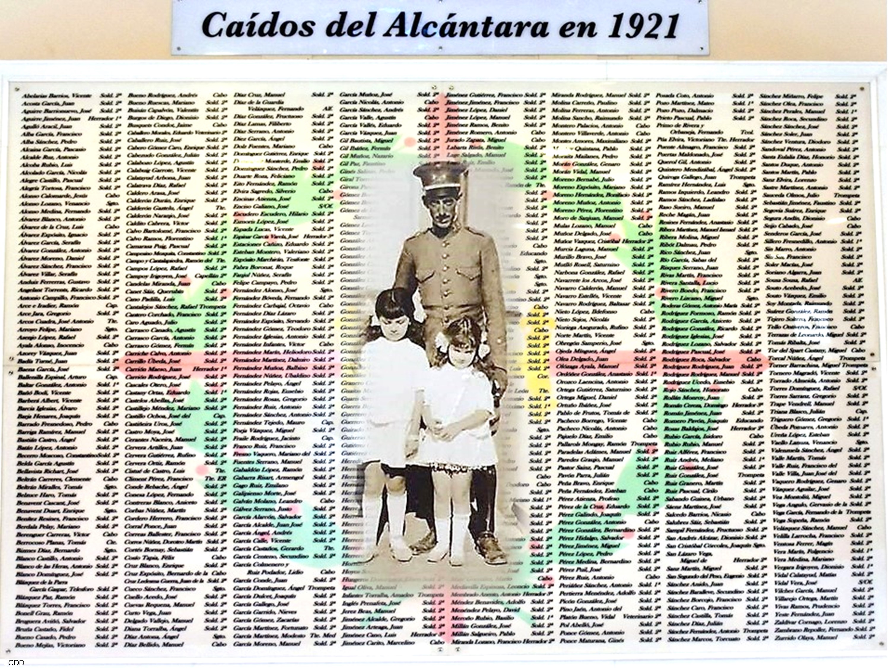 (Capitán José del Castillo Ochoa -que tuvo un comportamiento ejemplar, falleciendo a consecuencia de las heridas sufridas en los combates de Dar Azugaj-, con sus hijas Pilar y María Luisa, que perdieron a su padre, sobre el listado de los numerosos Caídos del Alcántara, que se encuentra en la Sala Histórica del Regimiento en la Base Alfonso XIII, Melilla).