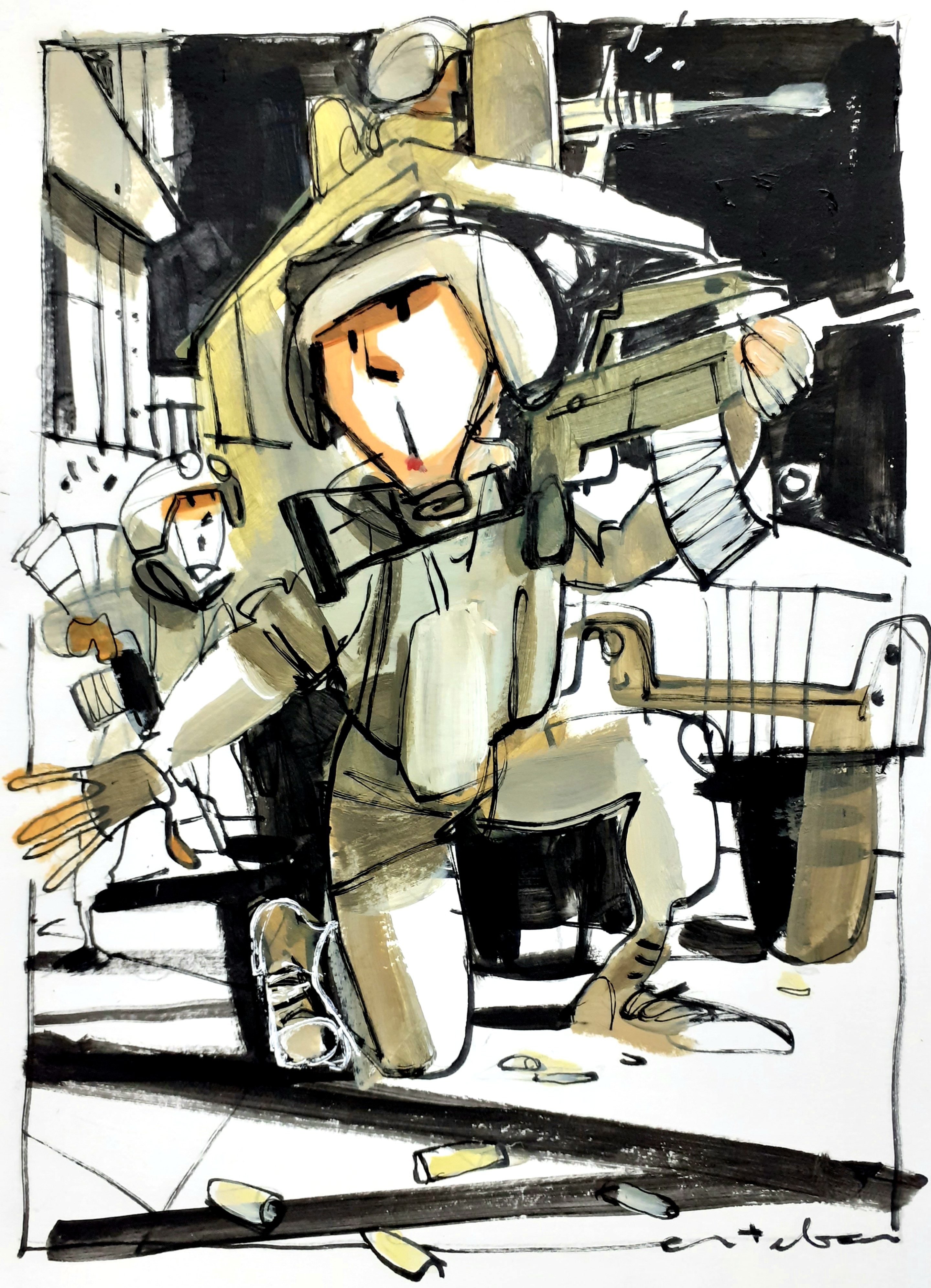 María José ha salido del vehículo y ha empezado a disparar. Ha localizado a varias personas a unos cien metros de la comisaría en unos agujeros horadados en el barranco, pero todavía no sabe si son insurgentes o policías que han huido. La distancia que les queda para arribar a las últimas sospechas la cubren rápido con la obligación de moverse constantemente para no convertirse en objetivo.