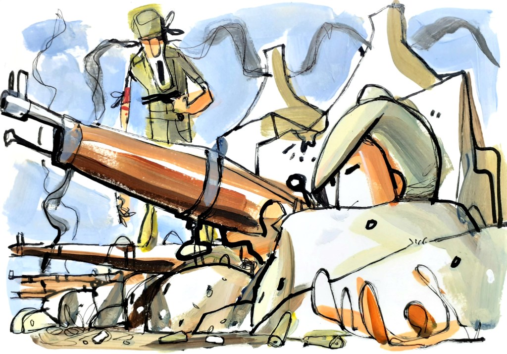 El enemigo, al ver que contra esos 23 soldados es necesario algo más que fuego de fusil, ha recrudecido el ataque, apoyando a su infantería con cañones. Dos proyectiles caen dentro del blocao, cubriendo de cascotes a los defensores. El sargento Ascoz decide entonces que la fuerza salga del blocao y se sitúe en la alambrada, detrás de los sacos y en la trinchera, donde tendrá una mejor protección ante el fuego artillero. Y combatiendo estuvieron hasta el anochecer, una relativa oscuridad que trae un poco de calma y hace que el sargento decida volver dentro del blocao. Pero eso no significa que llegue el descanso, porque durante toda la noche deben dedicar sus esfuerzos a reparar los cuantiosos daños que han provocado en las defensas los cañones. Siguen combatiendo, reparando, animándose, cuidando de sus heridas, que ya son muchas.