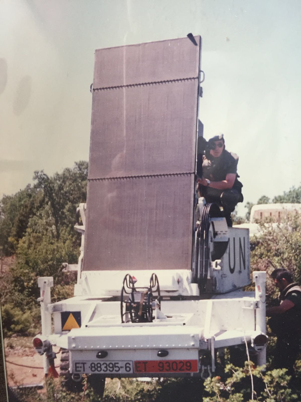 Como cualquier militar, la primera salida queda en la memoria para siempre y, más aún, si se trata de Bosnia, en 1994. Allí, el MACA desplegó los radares AN/TPQ-36 por primera vez, concretamente, en Mostar. “Me marcó mucho por todas las dificultades que vivimos; no teníamos los mismos medios tecnológicos de ahora y veíamos el conflicto de cerca. Se trataba de una misión compleja, en la que no sabíamos a lo que nos enfrentábamos como cascos azules”, reflexiona. Recuerda con nostalgia cómo las llamadas eran de cinco minutos al día, y las conversaciones muy complicadas por el retardo.