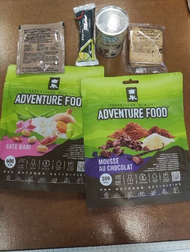 Las raciones liofilizadas están compuestas por productos alimenticios a los que se les ha extraído la humedad para, una vez empaquetado el producto, reducir el peso de la comida original. Constan de tres tipos de menú: desayuno, comida y cena. Las muestras recibidas se componen de una bolsa de arroz con jamón y salsa saté, otra bolsa de mousse de chocolate (ambos liofilizados), un paquete de pan galleta, un sobre de bebida isotónica, una barrita energética y un cóctel de frutos secos.