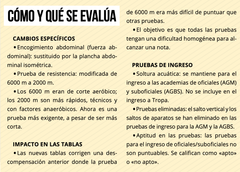 Uno de los cambios más significativos en las pruebas de preparación física afecta a la fuerza abdominal. El tradicional encogimiento abdominal ha dejado paso a la plancha abdominal isométrica. Esta sustitución coincide con un proyecto propio que el Ejército de Tierra ya tenía en marcha.