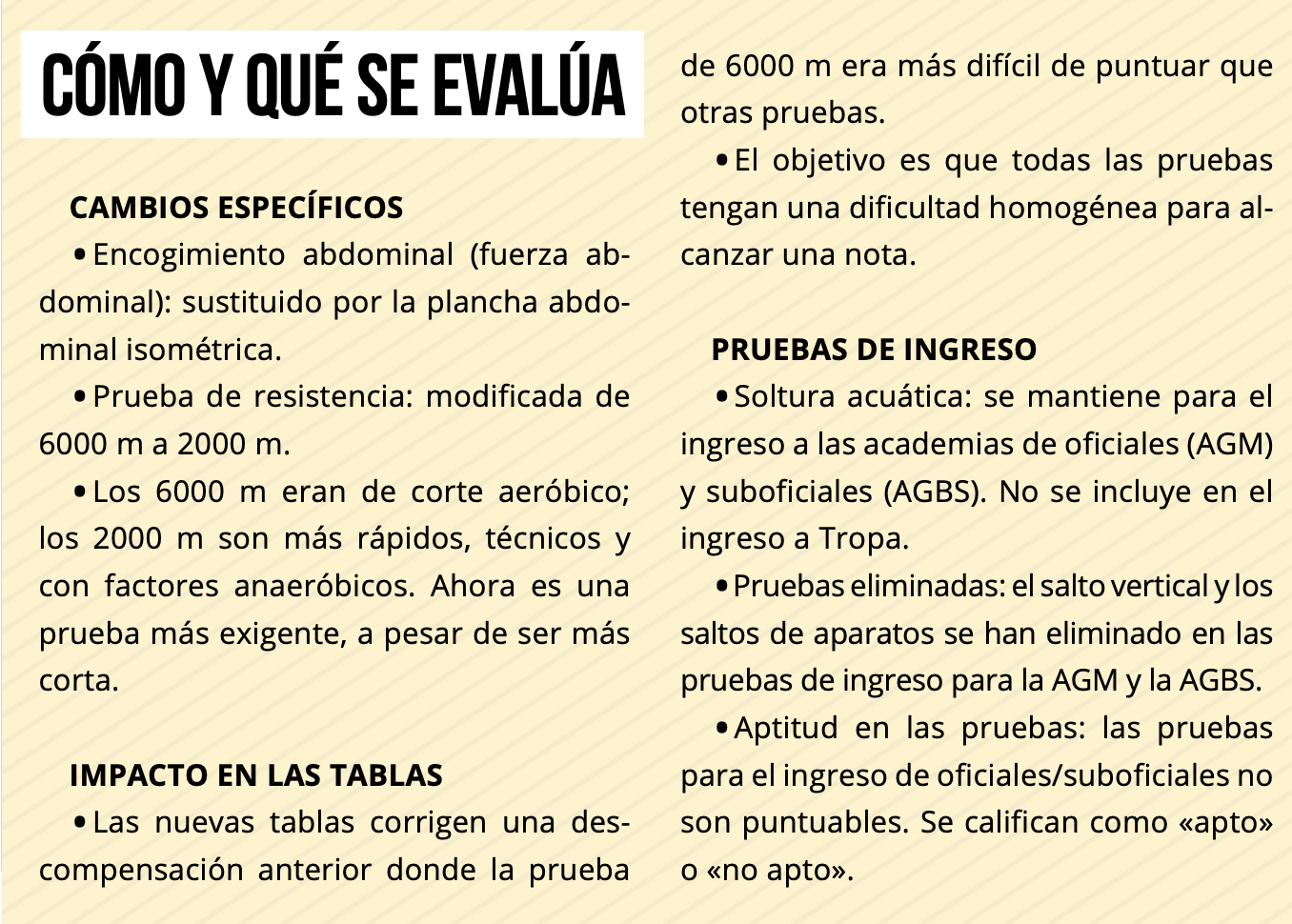 Uno de los cambios más significativos en las pruebas de preparación física afecta a la fuerza abdominal. El tradicional encogimiento abdominal ha dejado paso a la plancha abdominal isométrica. Esta sustitución coincide con un proyecto propio que el Ejército de Tierra ya tenía en marcha.