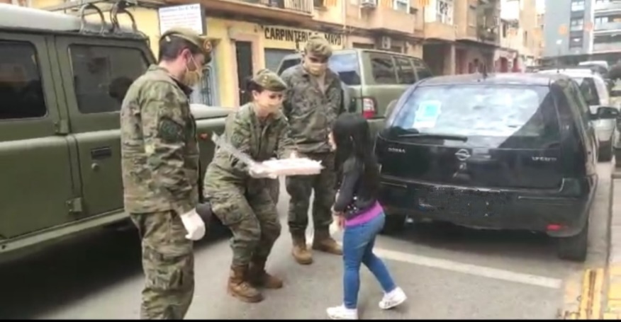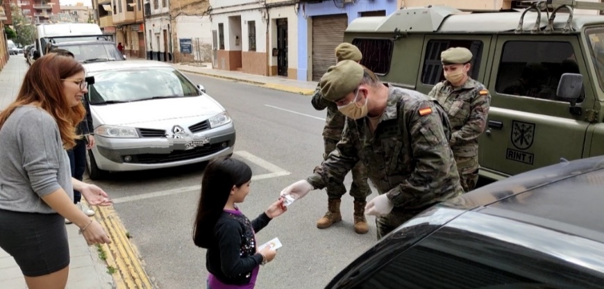 El pasado día 06 de Abril y como agradecimiento a la familia Ruiz Mugí, de la población de Mislata, por la donación altruista al Regimiento de Inteligencia nº 1, integrado en la Operación “BALMIS”, de 800 mascarillas protectoras y 70 pantallas de protección facial, para la prevención del contagio de COVID-19, el Ilmo. Coronel Jefe D. Carlos Javier Armada Vázquez, junto con una representación de personal de tropa del regimiento, se desplazan a la vivienda de la familia para felicitar y entregar una tarta el día de su noveno cumpleaños a Ariadna, la menor de la familia.