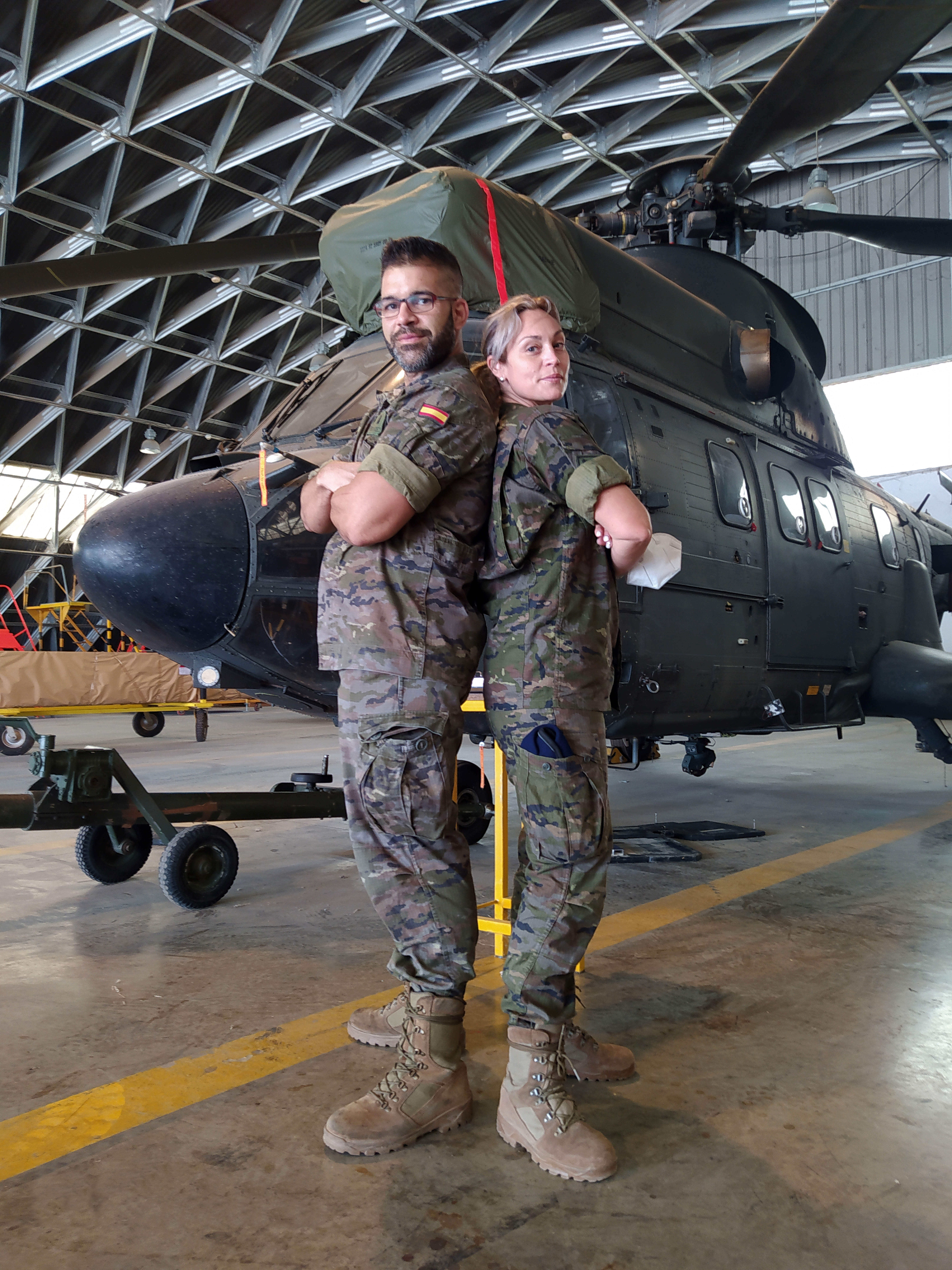 En la casa de los Fernández Naharro se hace deporte, y mucho. Los ejercicios de cardio y musculación son el pan nuestro de cada día para David y Melanie. O lo que es lo mismo: para el cabo Fernández y la cabo Naharro. Este matrimonio de treintañeros, padres de dos hijos y destinados en el Batallón de Helicópteros de Maniobra IV, en Sevilla, no solo comparte profesión sino, también, pasión: el culturismo. Él practica la modalidad clásica y ella la de fitness, lo que explica que dediquen una media de dos horas diarias a entrenarse.